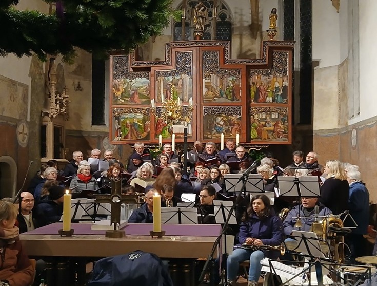 Dorfkemmathen. Bis auf den letzten Platz gefüllt war die Dorfkemmathener Marienkirche am Samstag, den 13.12.2025, als der Gesangverein „Liederkranz“ zu seinem „Adventskonzert“ lud. Als Ehrengäste konnte 1. Vorstand Willi Mack - unter anderem - Bürgermeister Simon Schäffler, dessen Stellvertreter Horst Binder und Pfarrer Simeon Prechtel begrüßen. Neben den Alphornbläsern „Lusum“ (Dinkelsbühl) konnten sich die Besucher auch an den Auftritten des „gemischten Chores“ (siehe Bild), der „Sing-Kids“ (mit Akkordeon-, Flöten und Gitarrenunterstützung), des Posaunenchores, des Gesangsduos Juno und Sarah sowie an den beeindruckenden Solos von Renate Früh (Orgelspiel) und Katharina Jung (Gesang) erfreuen. Ob von „Süßer die Glocken nie klingen“ bis „We wish you a merry Christmas“ oder von „Feliz Navidad“ bis „Ring Christmas Bells“: Den zahlreichen Zuhörerinnen und Zuhörern wurde ein breites, abwechslungsreiches und äußerst kurzweiliges Programm geboten. Im Rahmen seines Grußwortes würdigte Herr Pfarrer Simeon Prechtel auch den hervorragenden Einsatz von Monika Zischler, die die Organisation der Veranstaltung maßgeblich verantwortete. Im unmittelbaren Anschluss an das von der gesamten Gemeinde gesungene und vom Posaunenchor umrahmte Weihnachtslied „O du fröhliche“ startete dann am Dorfbrunnen ein wahrlich sehenswerter „Budenzauber“ mit Würstchen, Waffeln, Feuerzangenbowle, Glühwein und etlichen weiteren Leckereien. Die Gemeinde Langfurth dankt allen, die an der so wunderbaren Durchführung dieser Veranstaltung beteiligt waren. Bis zum nächsten Jahr …